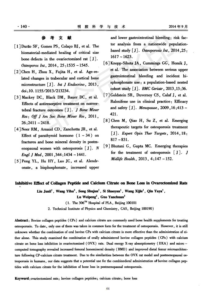 膠原蛋白肽與檸檬酸鈣聯(lián)用抑制去卵巢大鼠骨丟失