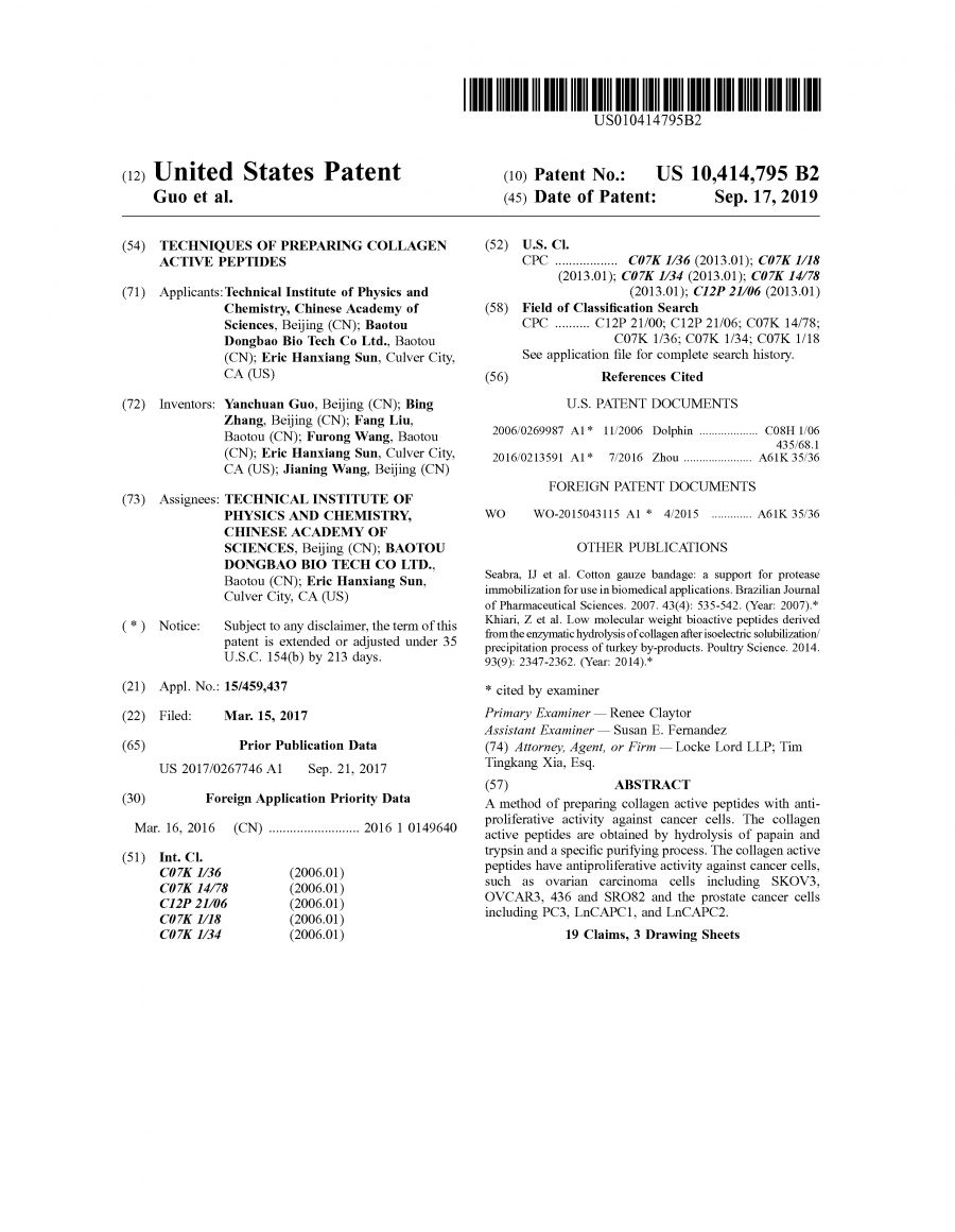 專利名稱:《TECHNIQUES OF PREPARING COLLAGEN ACTIVE PEPTIDES》(膠原蛋白活性肽制備技術)